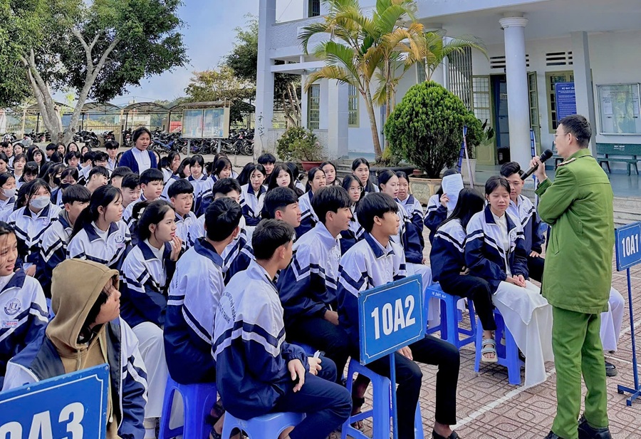 Bên cạnh nội dung pháp luật, báo cáo viên tập trung hướng dẫn kỹ năng ứng xử văn minh, giải quyết mâu thuẫn bằng đối thoại, biết chia sẻ, hỗ trợ bạn bè trong học tập và đời sống. Học sinh cũng được trang bị kỹ năng bảo vệ bản thân, cách báo tin cho thầy cô, gia đình hoặc Công an xã khi phát hiện các vụ việc liên quan đến bạo lực học đường.