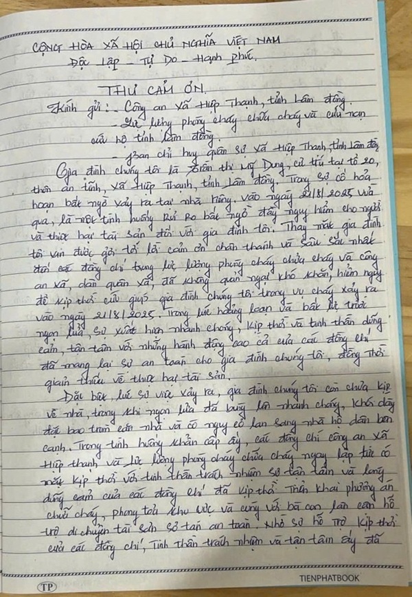 Trong thư, chị Dung xúc động viết: “Chứng kiến hình ảnh các đồng chí không quản ngại nguy hiểm, xông pha giữa khói lửa để bảo vệ an toàn cho gia đình và bà con lối xóm, chúng tôi thực sự xúc động và càng thêm trân trọng sự hy sinh thầm lặng của lực lượng Công an. Sự tận tâm, trách nhiệm và tinh thần ‘vì Nhân dân phục vụ’ của các đồng chí đã để lại trong lòng gia đình chúng tôi niềm biết ơn sâu nặng, đồng thời là bài học quý giá về lòng dũng cảm và tình đồng bào.”
