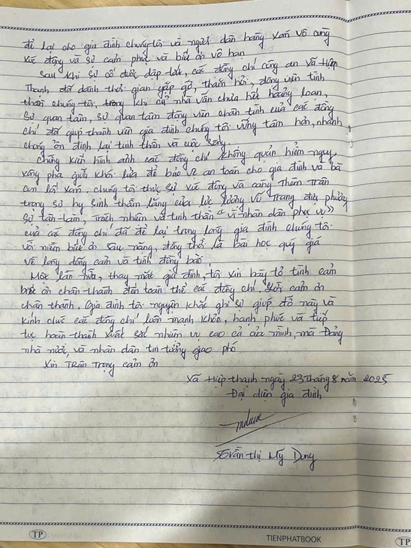 Lá thư cảm ơn ấy không chỉ là lời tri ân, mà còn là minh chứng sống động cho hình ảnh người chiến sĩ Công an nhân dân – những người luôn sẵn sàng có mặt nơi gian nguy, bất chấp hiểm nguy để bảo vệ bình yên cho Nhân dân. Đó cũng là sự ghi nhận chân thành nhất đối với những nỗ lực âm thầm, kiên cường của lực lượng Công an trong mọi mặt trận phòng chống tội phạm, phòng chống thiên tai, cứu hộ cứu nạn.