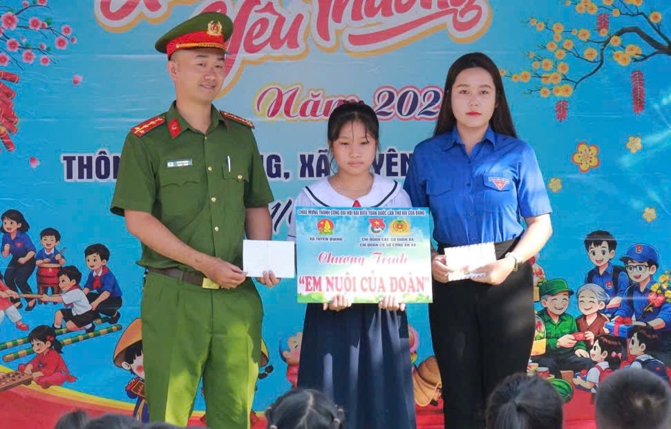 Nhân dịp này, Chi đoàn Công an xã Tuyên Quang phối hợp với Đoàn Thanh niên xã đã trao tặng 25 phần quà, mỗi phần trị giá 400.000 đồng cho các gia đình chính sách và học sinh có hoàn cảnh khó khăn; đồng thời hỗ trợ Chương trình “Em nuôi của Đoàn”, qua đó thể hiện tinh thần trách nhiệm, sự quan tâm, sẻ chia của tuổi trẻ lực lượng Công an và đoàn viên, thanh niên địa phương đối với cộng đồng.