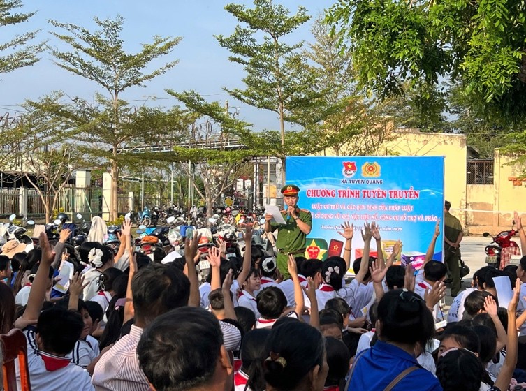 Chương trình thu hút gần 250 người tham gia, gồm học sinh, giáo viên, phụ huynh và đoàn viên, thanh niên trên địa bàn. Trong khuôn khổ hoạt động, Chi đoàn Công an xã Tuyên Quang đã phối hợp tổ chức tuyên truyền Luật Cư trú và các quy định của pháp luật về quản lý, sử dụng pháo, vật liệu nổ cho học sinh. Nội dung tuyên truyền được triển khai bằng hình thức trực quan, dễ hiểu, góp phần nâng cao nhận thức, ý thức chấp hành pháp luật cho các em, nhất là trong thời điểm trước, trong và sau Tết Nguyên đán. Bên cạnh đó, chương trình còn tổ chức giao lưu, tìm hiểu kiến thức pháp luật thông qua hình thức đặt câu hỏi xoay quanh các nội dung đã được phổ biến, tạo không khí sôi nổi, thu hút đông đảo học sinh tích cực tham gia, giúp các em củng cố kiến thức pháp luật đã được trang bị.